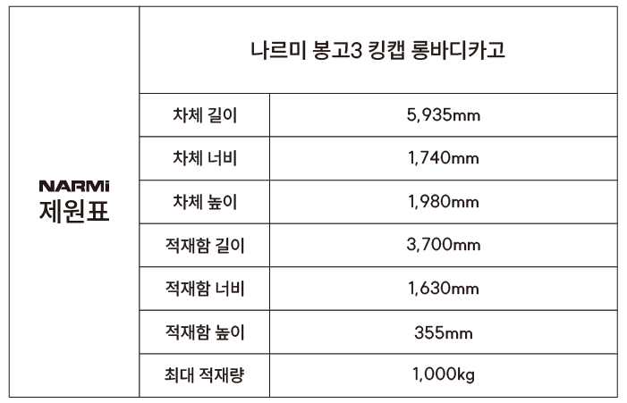 | 나르미모터스 1톤 봉고 표준캡 축연장 롱바디 모델[적재함 길이3900mm] (2) | 2025.05.12 |