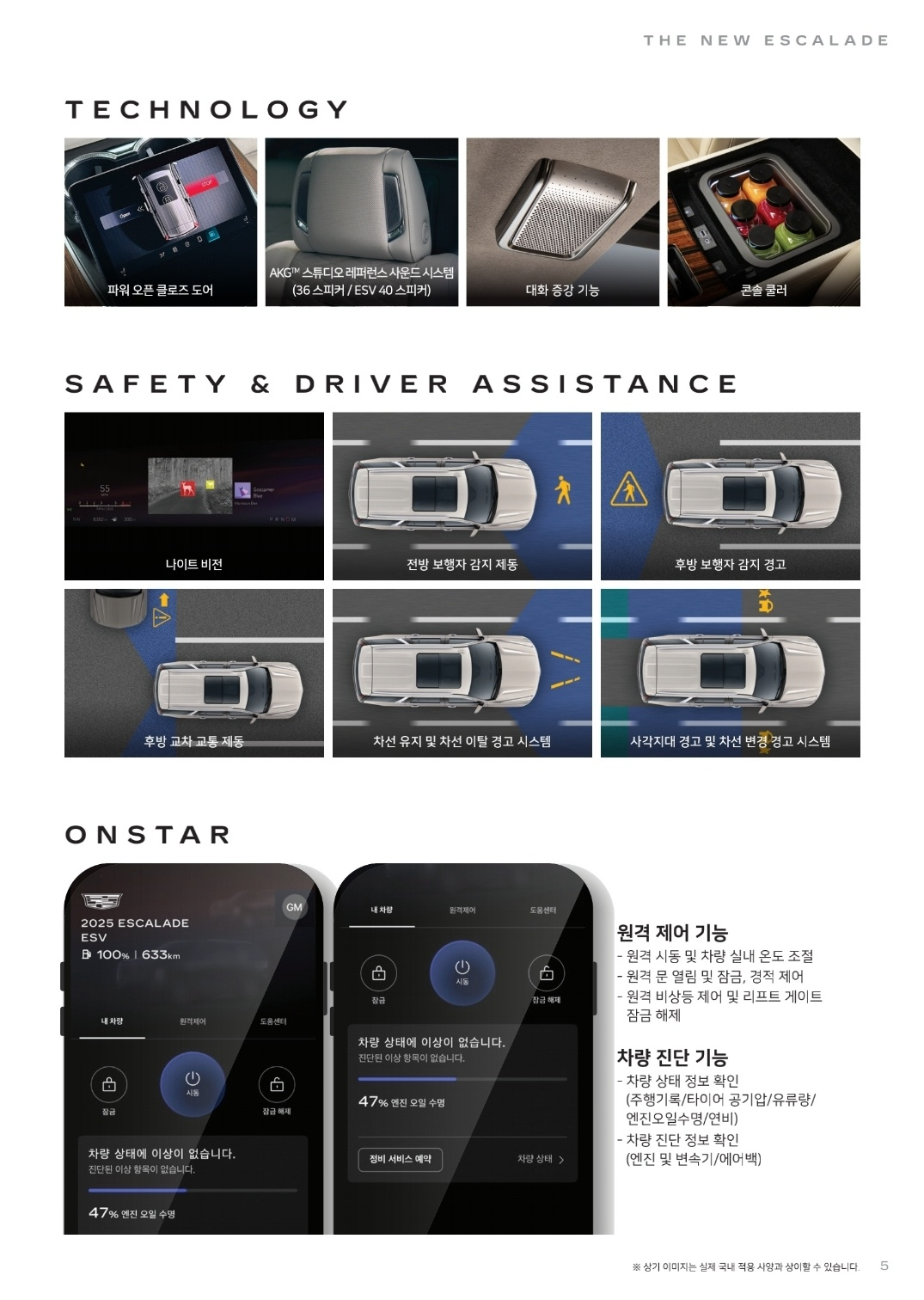 - 최고의 사운드 경험, AKG 스튜디오 오디오 시스템: 음향 전문 브랜드 AKG와 협력하여 개발된 사운드 시스템은 '더 뉴 에스컬레이드'의 럭셔리함을 한층 더합니다. 기본 트림에는 19개 스피커로 구성된 AKG 스튜디오 오디오 시스템이, 상급 트림에는 최대 36개 스피커로 구성된 AKG 스튜디오 레퍼런스 오디오 시스템이 탑재되어 콘서트홀에 버금가는 최상의 사운드 경험을 제공합니다.